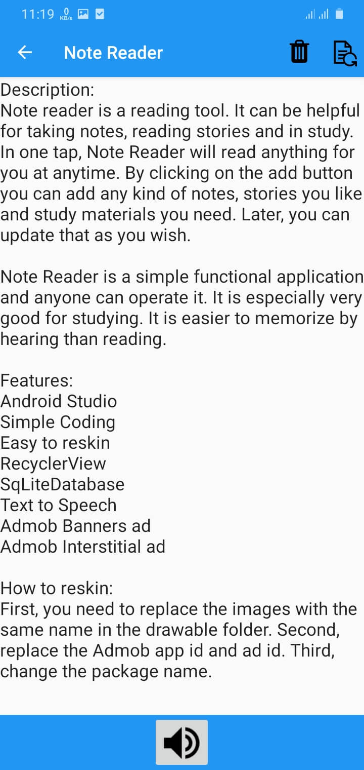 Note reader is a reading tool. It can be helpful for taking notes, reading stories and in study. In one tap, Note Reader will read anything for you at anytime. By clicking on the add button you can add any kind of notes, stories you like and study materials you need. Later, you can update that as you wish.